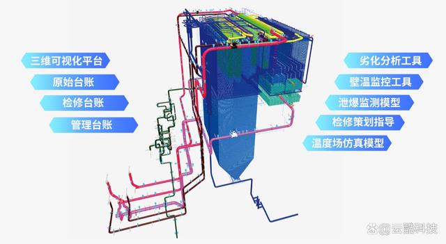 1、三维可视化交互平台:建立1:1高仿真三维模型,实现与原始台账、检修台账、泄爆记录、壁温监测、劣化分析等数据的互通互联。