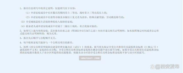 5.按照《西安市租赁型保障房建设管理实施办法(试行)》的要求,摇号优先保证享受公共租赁住房最低租金标准(2.89元/月·建筑面积平方米)家庭的住房分配;享受公租住房租金标准家庭将在剩余房源中进行摇号分配。如果享受公共租赁住房最低租金标准的家庭报名数量大于该小区所提供的房源数量,则报名该小区的享受公租住房租金标准家庭将不参与该小区的摇号。