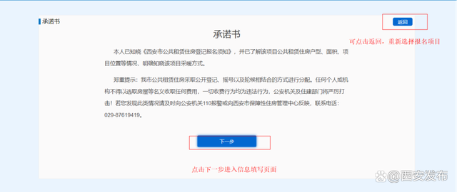 第七步:进入承诺书页面点击【下一步】,或点击【返回】,可重新选择报名项目,如图: