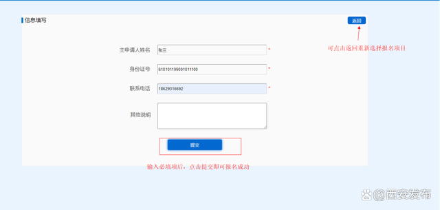 第八步:进入信息填写页面,输入姓名、身份证号、联系电话(必填项)、其他说明(选择性填写),点击【提交】即可报名成功。也可点击【返回】重新选择报名项目,如图: