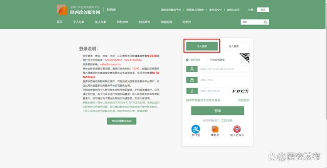 第二步:点击【个人统一认证登录】,进入陕西省政务服务网,选择【个人登录】,如下: