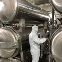 喷淋杀菌锅是注入少量工艺用水,达到预定位置(不能浸泡产品)通过高效循环泵-过滤器-高效换热器将水注入到喷淋管道,然后通过喷淋嘴将热水喷射出雾化状至食品表面,锅内热分布均匀,无杀菌死角。水通过换热器进行间接加热和冷却,升温和冷却速度迅速,能高效、全面、稳定的对产品进行杀菌。。