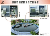 利用双向混合信号无线装置DTD122FHCY将采集到的浓缩池含水率、清水流量等传感器数据无线传输到就地程控柜的PLC内,再通过PLC程序判断,输出控制指令给刮泥机。