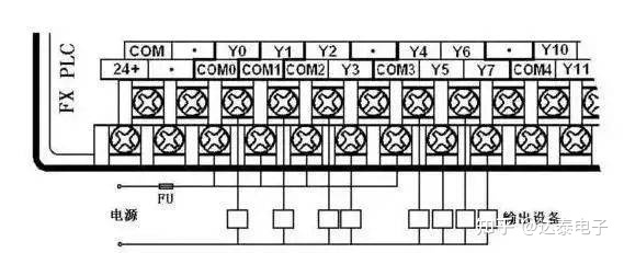 以FX2N为例说明PLC与输出设备的连接方法。图中接法是输出设备具有相同电源的情况,所以各组的公共端连在一起,否则要分组连接。图中只画出Y0-Y7输出点与输出设备的连接,其它输出点的连接方法相似。