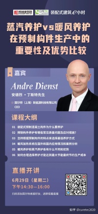 如果你是来自混凝土PC构件生产行业的伙伴们,还有其他混凝土制品生产行业的朋友们,如砌块砖、仿石、有色砖、铺路石、ST板、预应力混凝土、管桩和电杆、管道、预制梁和柱、底下管廊、屋面瓦、隧道管片、隧道箱涵、路桥段、铁路轨枕、UHPC超高新能混凝土、GRC装饰混凝土、市政产品等,且遇到了如上的问题,不用着急。6月29日,我们将邀请德国混凝土养护专家Curetec固尔特中国总部——固尔特(上海)新能源科技有限公司CEO Andre Dienst 安德烈▪丁斯特先生来和大家分享:德国的装配式建筑混凝土养护技术现状和最新技术分析,国内混凝土养护如何选择合适的方案,结合国内外经验和技术以及自身情况提高养护效率和产品质量,节约生产成本?