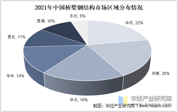 从区域分布情况来看,2021年我国桥梁钢结构市场中,华东地区占比最高,为22%。其次为华南和华北地区,占比分别为20%和18%。