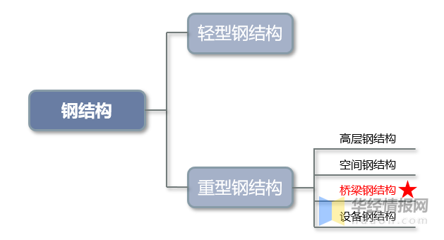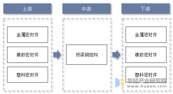 桥梁钢结构行业产业链上游为原材料环节,主要包括钢材、焊材、防腐涂料等;中游为桥梁钢结构生产供应环节;下游主要应用于公路桥梁、铁路桥梁、城市高架桥梁等桥梁工程建设。