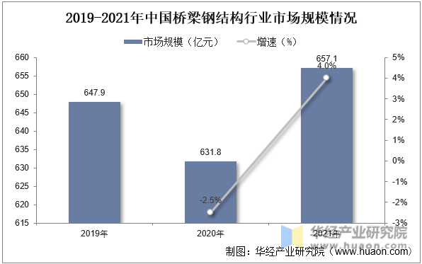 随着我国对于桥梁等基础设施建设投资力度的不断加大,我国桥梁钢结构行业规模得以迅速发展。2020年受疫情影响,行业规模有所下降,2021年在疫情被有效控制的情况下,国内经济快速复苏,行业规模得以恢复增长。据资料显示,2021年我国桥梁钢结构行业市场规模为657.1亿元,同比增长4%。