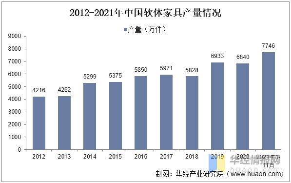 从产量来看,根据国家统计局数据,2021年1-11月,我国软体家具产量累计达到7746.3万件,同比增长28.11%。