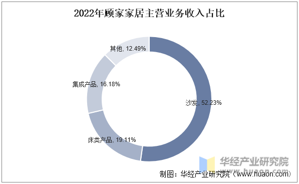 从主营业务结构来看,顾家家居主营业务包括沙发、床类用品、集成产品和其他。根据公司22年中财报,沙发营收占比最高,其次为床类产品,分别占比52.23%、19.11%。