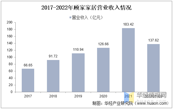 从营业收入来看,根据公司财报,2017-2021年顾家家居营业收入呈现逐年上涨趋势,2020至2021年增速较快,2022年前三季度营收137.62亿元。
