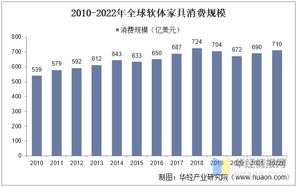 从全球消费来看,据统计,2021年全球软体家具消费规模达690亿美元,2010-2021年CAGR达2.27%。预计2022年全球软体家具消费规模将达到710亿美元。