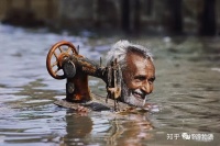 印度发了洪水,一名老裁缝背着他的缝纫机。