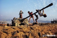 伊拉克的孩子们把一架高射炮当初了玩具,地下没有一块平坦的地方,铺满炮弹残骸。