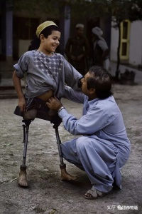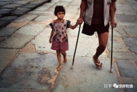 巴基斯坦一个只有一只腿的父亲牵着女儿。