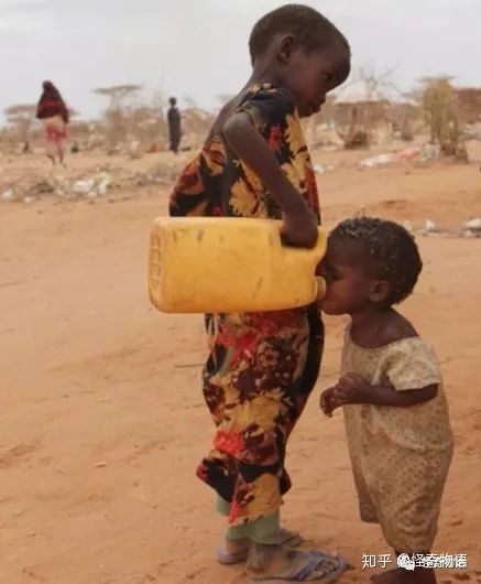 非洲极度干旱地带,一位年长的黑人小孩正在给小弟弟喂水。