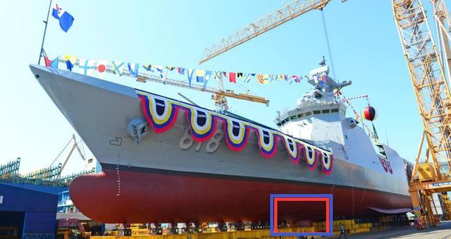 事实上,很多军舰都喜欢在船底装些设备,如声纳之类的,像棒子的这条护卫舰,看红框处就装了个固定声纳。