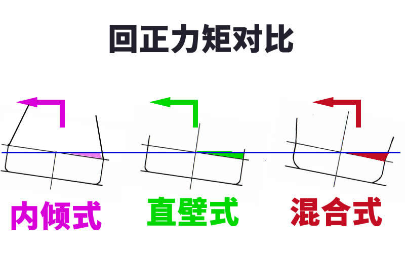 我们知道所谓的排水量就是入侵到水中的体积越大,所受到的浮力也越大。这三种船身倾斜时候,当其他条件相同时(倾角,GM,重心等因素),苏联和003的混合式一侧船身浸入水中体积最大,回正力矩也是最高的。对船只恢复平衡状态最有帮助。美国的直壁式则适中,不如混合式好。但是美国航母通常选择的水线宽度较宽,也能符合使用要求。而且还有结构简单连贯优势。内倾式的扶正力矩是最小的。风帆时代到前无畏舰的船喜欢用这种剖面,自从对马海战,博罗季诺糟糕表现后,已经没主力舰会用这样的剖面了,直到DDG1000出现。