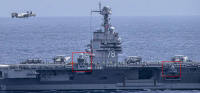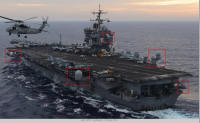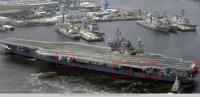 然而,小鹰继续服役到,期间又进行了几次小升级,看看2008年的状态,飞行甲板左侧和后侧全部增加凸台,用于加装天线。见红框处~
