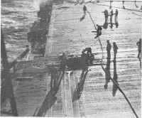 在二战,约克城级中个弹,甲板一个洞。铺下木板就能继续起降。比如下面的这个洞,企业号南太时的战损。