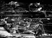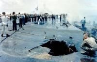 这是企业号甲板火灾,停在甲板上的飞机被波及,炸除了不少洞。甲板成这样了,升降机能用又如何?
