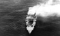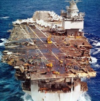 损管在甲板用水灭火,但是着火的油从破口漏到了下面甲板。机库的防火帘也降下来。旁边的驱逐舰只能射水帮助船壳降温。但是也造成了轻微的侧倾。