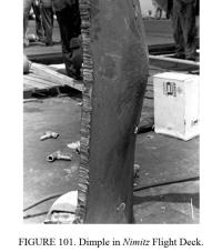 经过高温烧过的甲板,强度下降,哪怕没穿洞都要考虑下是否还满足起降强度要求。毕竟现代战机已经不是二战那些几吨的小家伙了。尼米兹飞行甲板够厚了吧?一个A6降落事故撞到停机区,照样掀起你甲板!看下图