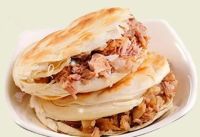 菜夹馍就有点古怪了。白膜劈开,塞进去土豆丝、青辣椒、海带丝……这也罢了,居然还有辣子夹馍,还有花椒夹馍!额滴神呀。
