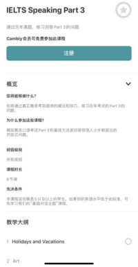 如果你是想找雅思口语陪练,Cambly上也有专门的雅思前考官担任外教的针对雅思口语开设的练习课程,在不断训练你的应试口语表达的同时,能根据雅思考试的要求,帮助你找到并改正目前口语表达中存在的问题。个人感觉这可比动辄好几千甚至上万,报一个雅思口语一对一课程效费比高多了!下图就是针对雅思口语的part 3开设的培训课程相关界面了哦~