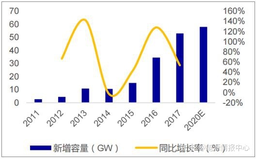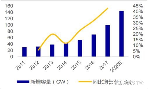 2011年-2020E全球新增光伏装机量及增速(单位:GW,%)