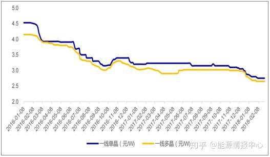 2016-2018国内多晶组件和单晶组件价格变化趋势(单位:元/瓦)