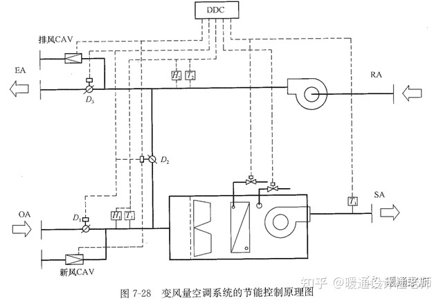 在变风量空调系统中,过渡季或冬季同样可以采用可调新风比的方法,利用自然冷源供冷,它的系统原理如下图所示。