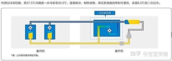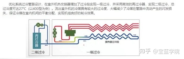 二次过冷技术不仅起到一定的节能效果,而且液态冷媒被二次过冷后冷媒输送距离得到了大幅提升(未被二次过冷的液态冷媒也许走个30米的铜管就会变成气液混合的状态,这样容易阻碍冷媒的输送,但是被“二次过冷”后走个40米可能还是液态)。
