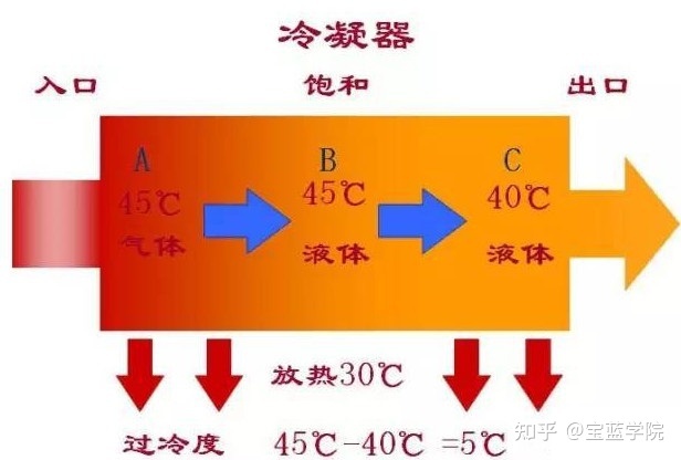 以R22冷媒为例,假设冷凝器内的压力为1.64MPa,则饱和温度为45℃。饱和状态的A-B间为45℃,A-B间冷媒为气液混合状态(潜热)。B-C间所有的气体已经变为液体,状态为全液体状态,并且不断向周围散热,使温度继续下降[本文来源:制冷百科公众号],譬如降至40℃ 。这时冷凝器出口温度比冷凝器内的温度低5℃,这种状态称为过冷,我们称这时流出的冷媒有5℃的过冷度(过冷度=45-40=5℃)。