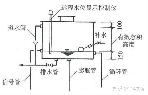 膨胀水箱上的配管有膨胀管、信号管、溢水管、排水管和循环管等。从信号管至溢出水管之间的膨胀水箱容积,就是有效膨胀容积。