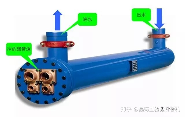 - 满液式换热器:水在铜管里面流。