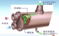 - 干式壳管器:冷媒在铜管里面流。