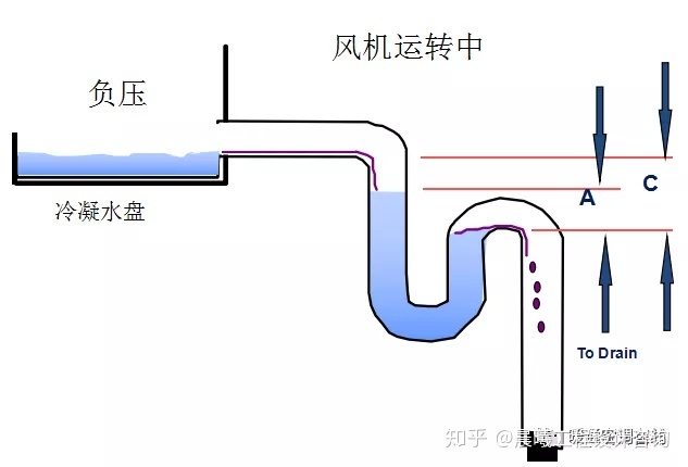 A与C的差值至少是正常运转的负静压按照经验差值要高于正常运转的负静压原因是肮脏的过滤网或风机启动时水封的跳跃引起的负静压升高。