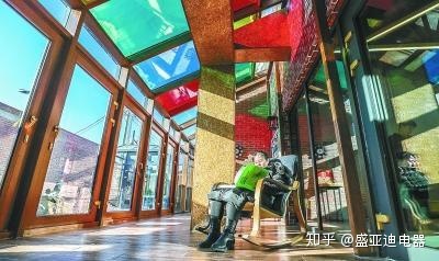 在“零舍”大门和客厅门之间,还有一座覆盖着彩色屋顶的阳光房,面积二十余平方米,冬日暖阳穿过七彩的透明屋顶,映得地面也都成了彩色。抬头观察这面屋顶,记者发现,它由14块彩色的盖板组成,这座建筑的设计建造方、天津市天友建筑设计股份有限公司的工作人员陈可心介绍,这些盖板是彩色光伏发电薄膜,总面积22.7平方米,不仅具有很好的透光性,还能发电。