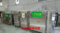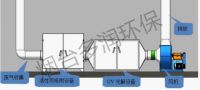 废气利用排风设备输入到光解式废气净化装置后,净化设备运用高能UV紫外线光束及臭氧对废气进行协同分解氧化反应,使废气降解转化成低分子化合物、水和二氧化碳,再通过排风管道排出室外。