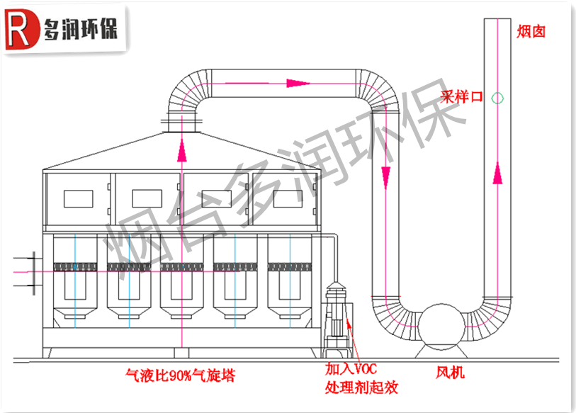VOC处理剂是近几年新兴的非甲烷总烃废气处理工艺,它的原理是将VOC处理剂加入到喷淋塔里或者专业的旋风塔里,让药剂和烟气在塔里进行接触反应,消除VOC废气的一种技术。