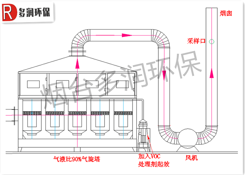 针对VOC处理难题,烟台多润环保经过研发测试,化繁为简,成功研发出低温湿法VOC处理工艺。 此工艺用脉冲喷射技术(高气液比、低带水量)使VOC处理剂与废气充分结合,完成皂化分解反应,达到VOC处理目的。工艺示意如下: