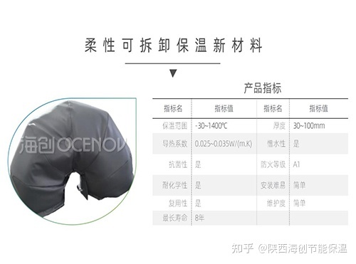 陕西海创实业发展有限公司自主研发的一种新型柔性可拆卸保温材料不仅阻燃隔热性能优异,同时可以柔性定制加工设计,满足各类异型设备的保温隔热需求,保温施工便捷、拆卸安装也很简单方便,可重复利用,减少维修作业费用,改善工作环境,降低热量损失,减少能源消耗,对高耗能行业节能降碳有着十分重要的意义。