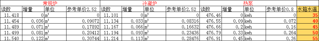 接下来是常规燃气炉,全预混冷凝炉,热泵的记录表