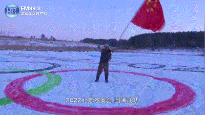 来自黑龙江大叔吴桐军在自家门前的雪地上创作了一幅高65米,宽100米的北京冬奥会会徽雪地画为北京2022冬奥会送上祝福