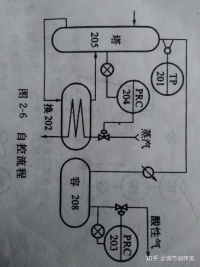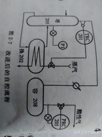 改进措施:容208的压力实际上代表着塔205的压力,故塔205的压力不需要再控制,而改用塔顶温度调节进换202的蒸汽量,使两个调节回路的响应速度变成一快一慢,减少互相干扰。改进后的自控流程如图2-7所示。