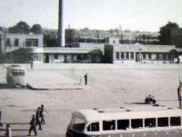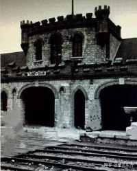不久,见到了比那个车站复杂的车站,站台多了,刚好我们要坐的火车与票房子之间,还隔着一个站台,好在那个站台当时没停车,斜对票房子检票口几十米远,有一条两米多宽,横穿铁路到另一个站台的枕木(枕木整齐地顺着铁路过道处挤在铁路空间)路,有穿制服的工作人员指挥通过。頗类下图(解放前的唐山站横穿铁路的枕木路)