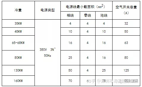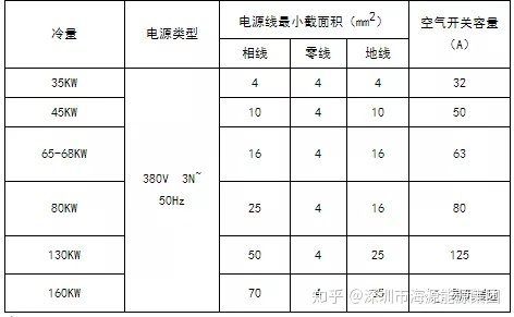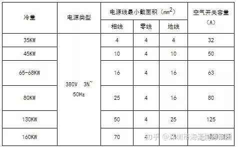 ② 上表中的断路器及电源线规格是基于机组最大功率(最大电流)选取。