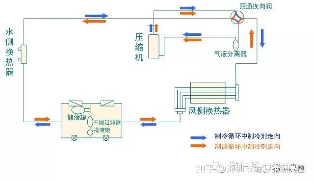 制热模式:压缩机排出的制冷剂高温气体在水侧换热器中冷凝成液体,经节流装置节流降压,进入风侧换热器,吸收热量蒸发后回到压缩机,完成一个制热循环;同时,从室内来的空调用水经过水侧换热器后被加热升温。