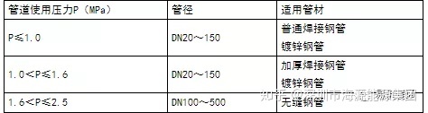 空调水系统的管道一般选用无缝钢管、焊接钢管、镀锌钢管,其中镀锌钢管属于焊接钢管的一种。空调水系统管道承压一般都小于1.0MPa,特殊要求的承压会达到1.6MPa,基本不会达到1.6MPa以上。管道可根据承压能力和管径按下表进行选择。